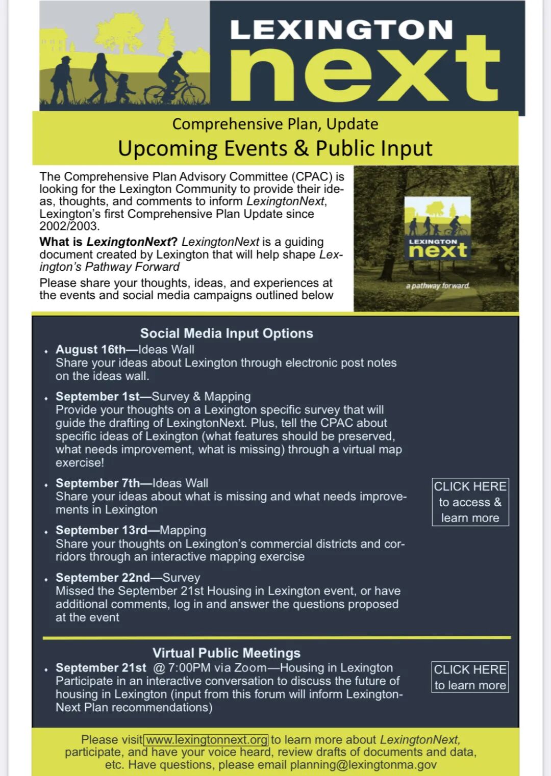 综合规划咨询委员会 (CPAC) 向 Lexington 社区发出邀请,请大家加入互动式对话来讨论 Lexington 的住房问题。主题领域将包括: Lexington 缺少哪些类型的住房 – 住房缺口在哪里? Lexington 如何创造适合生活中所有阶段的住房, 同时价格又能让更广泛的不同收入人群承担得起? Lexington 可以使用什么工具支持并推进Lexington 的住房公平? Lexington 可以从其他社区学到什么?