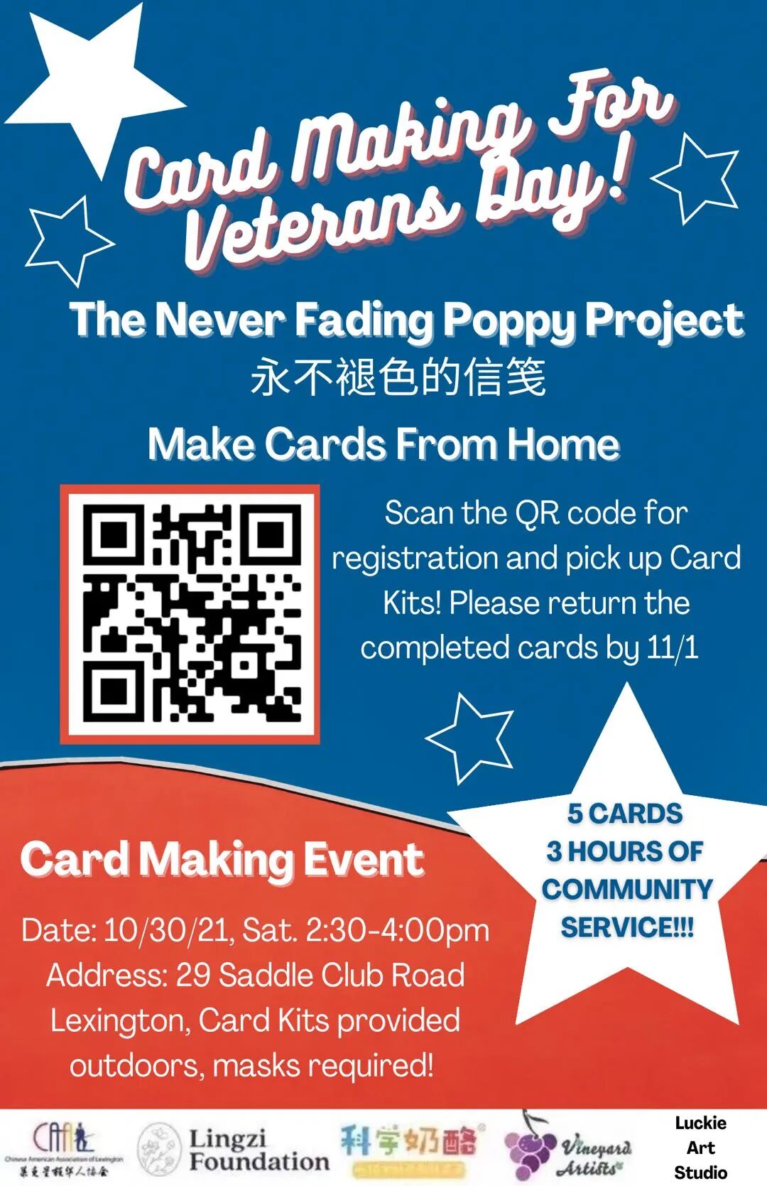 手工制作卡片将送给Bedford VA Hospital 的退伍军人和参加莱镇老兵节游行的老兵们。发挥你的艺术才华,画出你的爱心,感谢老兵们的服务和付出,写上温暖的祝福.