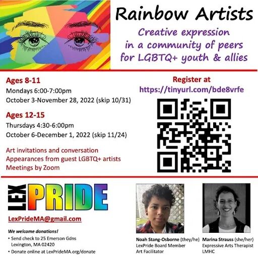 As usual, our fabulous art facilitators will create a safe space for queer youth and siblings/allies to practice creative expression skills, hang out, and enjoy each other. We hope to see you or your kids there!