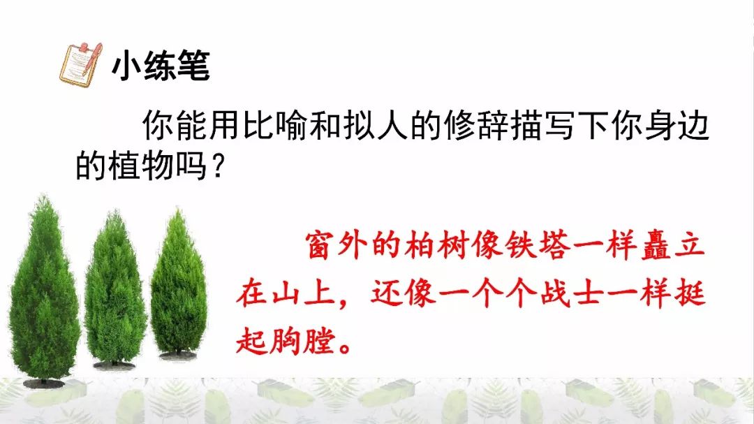 4.著名诗人戴望舒的《雨巷》中,有这样的诗句:“我希望逢着∕一个丁香一样的∕结着愁怨的姑娘。她是有∕丁香一样的颜色,丁香一样的芬芳,丁香一样的忧愁……”结合本文,体会“丁香”一词在诗中的含义。