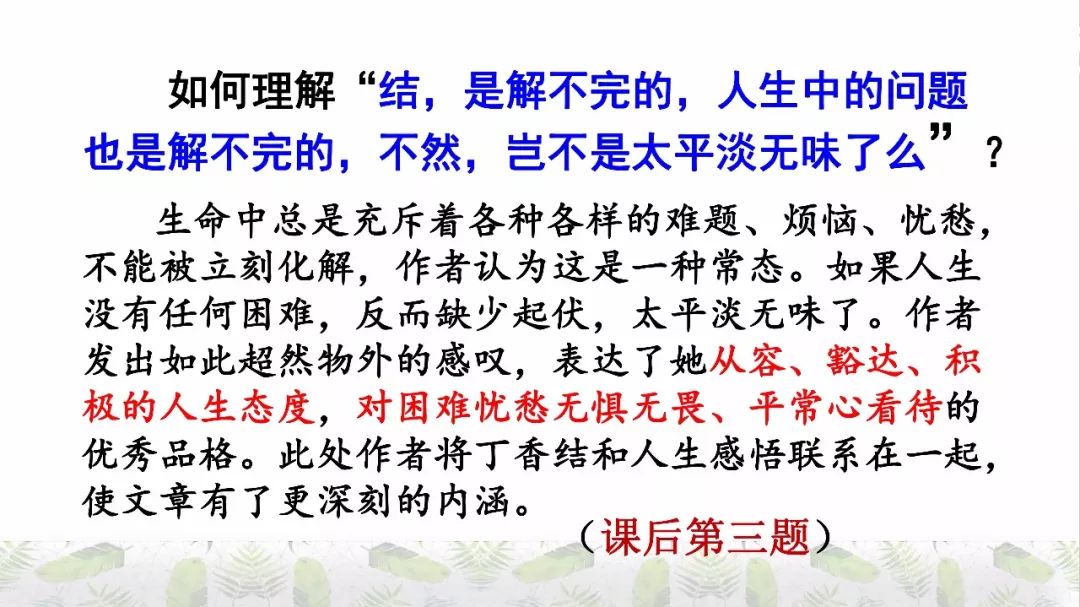 作者面对丁香,一反古人的情感,并不是一味地哀愁,更没有产生抱怨生活的想法,而是对人生有了更深刻的领悟。作者认为,人生中的问题永远存在,是解不完的;正因为解不完,人生才不至于平淡无味。当身处困境,面对棘手的问题时,我们不应该自暴自弃或怨天尤人,既然人生中的问题解决不完,何不乐观豁达一些呢?再者,人生的意义或乐趣也许就是在不断地解决人生问题的过程中产生的。平顺的路固然好走,可也失去了行走的快乐。
