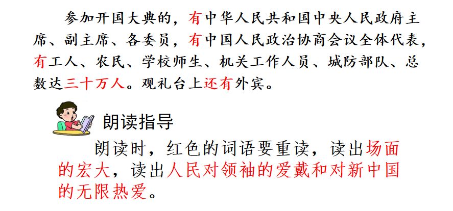 3、在记叙开国大典开始前的这一部分,课文先交代了举行开国大典的时间、地点和参加典礼的人员、人数,然后描述了会场的布置和群众队伍的场面。写出了典礼的盛大和隆重,参加典礼的人们那种激动、兴奋的心情。