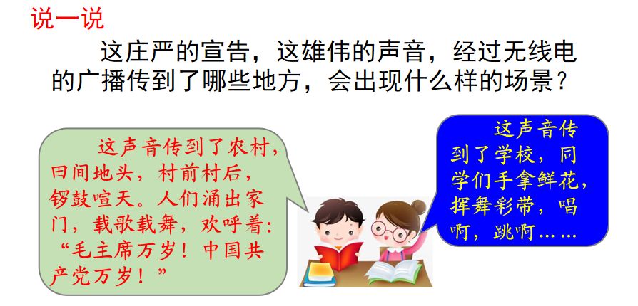 5、当毛主席宣布“中华人民共和国中央人民政府今天成立了”之后,课文用“这庄严的宣告,这雄伟的声音…”两个句子,表现了人民为新中国的诞生而欢欣鼓舞的心情。