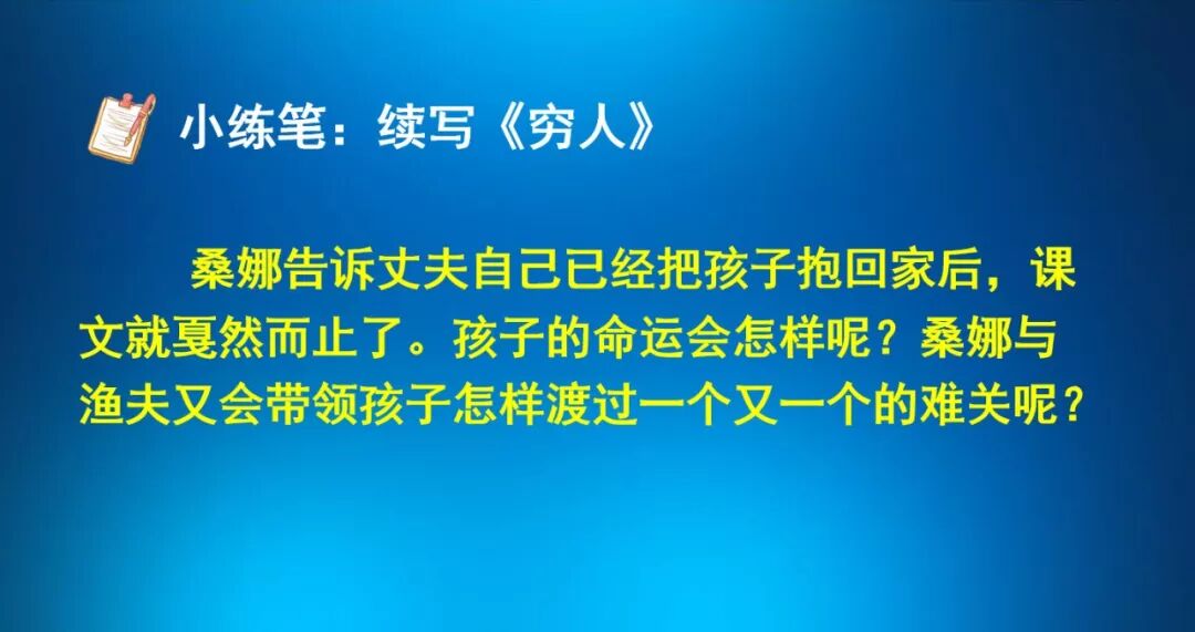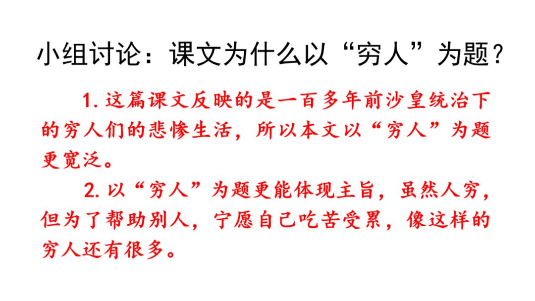 答:(1)题目中的“穷人”不仅仅指桑娜、西蒙两家人,更指当时沙皇统治下的所有穷人。(2)课文以“穷人”为题富有深意。文章通篇反映了桑娜和西蒙两家的贫穷,这是沙俄时期劳动人民悲惨生活的真实写照。但就是在这样贫穷的情况下,桑娜和渔夫做出了令人难以置信的举动:在自己有五个孩子要养的情况下,主动收养西蒙的两个孤儿。作者就是通过这样的事例,讴歌了穷人宁可自己受苦也要帮助别人的高尚品质,有力地抨击了当时上流社会的腐朽与堕落。