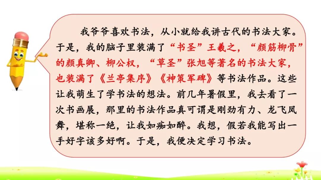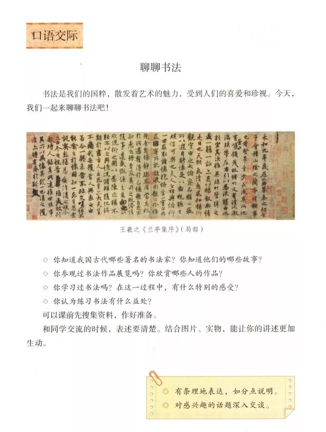 读一读问题提示,选一选你最想与大家分享的话题,是关于书法家的故事呢,还是参观书法展览的体验呢?注意选取的话题一定得是自己最清楚的关于书法的,最想与大家交流的。
