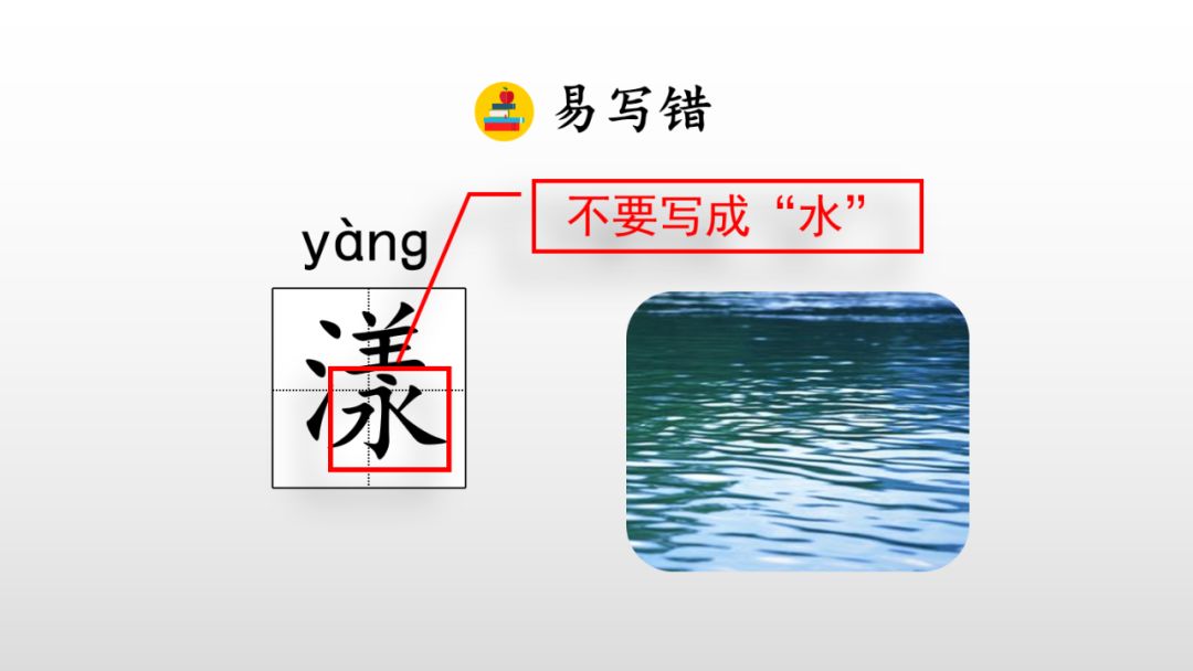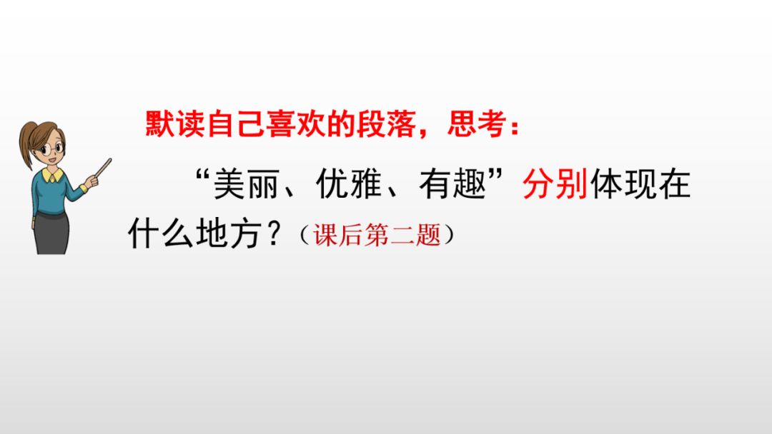 这个故事的”美丽,幽雅,有趣“体现在:景物具有江南特色,画面充满生活气息;景物的色彩鲜艳明丽,画面中的景物兼具静态美和动态美,摇曳多姿,充满生机与活力。另外,作者将各种景物置于荡漾的水中,景物本身与倒影交相辉映、虚实相间,趣味十足。