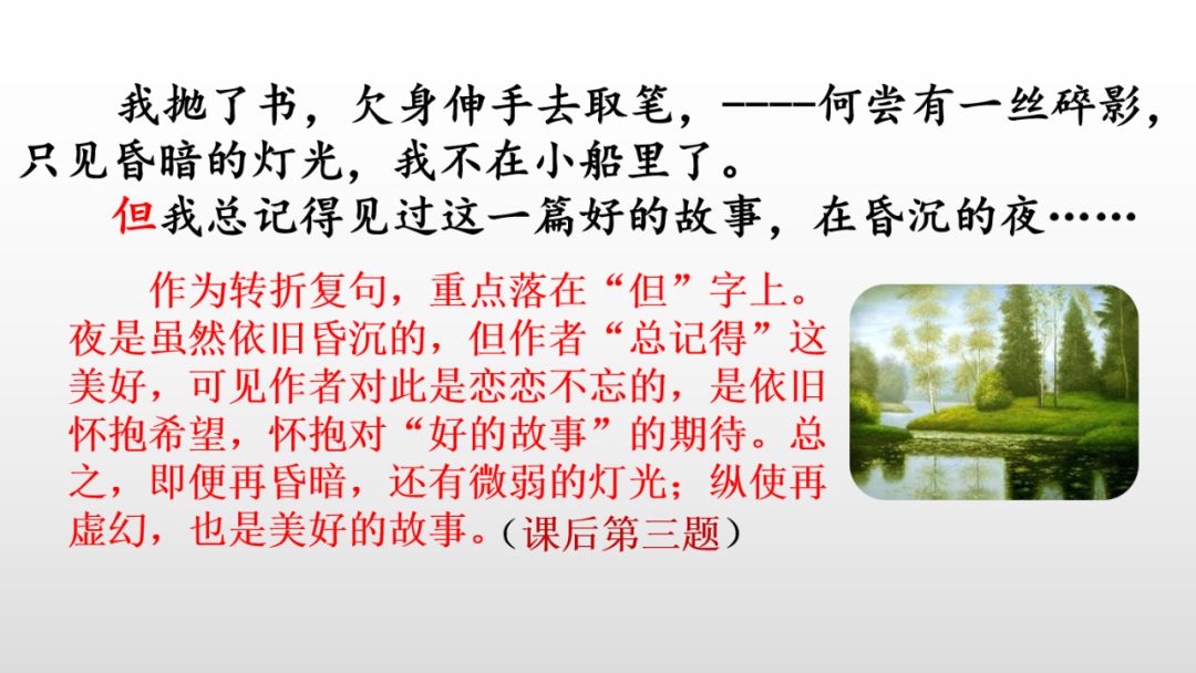 我真爱这一片好的故事,趁碎影还在,我要追回他,完成他,留下他。我抛了书,欠身伸手去取笔,----何尝有一丝碎影,只见昏暗的灯光,我不在小船里了。