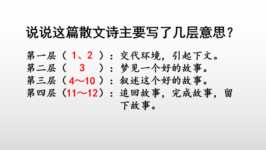 2、”好的故事“其实是一个梦境。这个故事的”美丽,幽雅,有趣“体现在哪里?结合课文内容说一说。