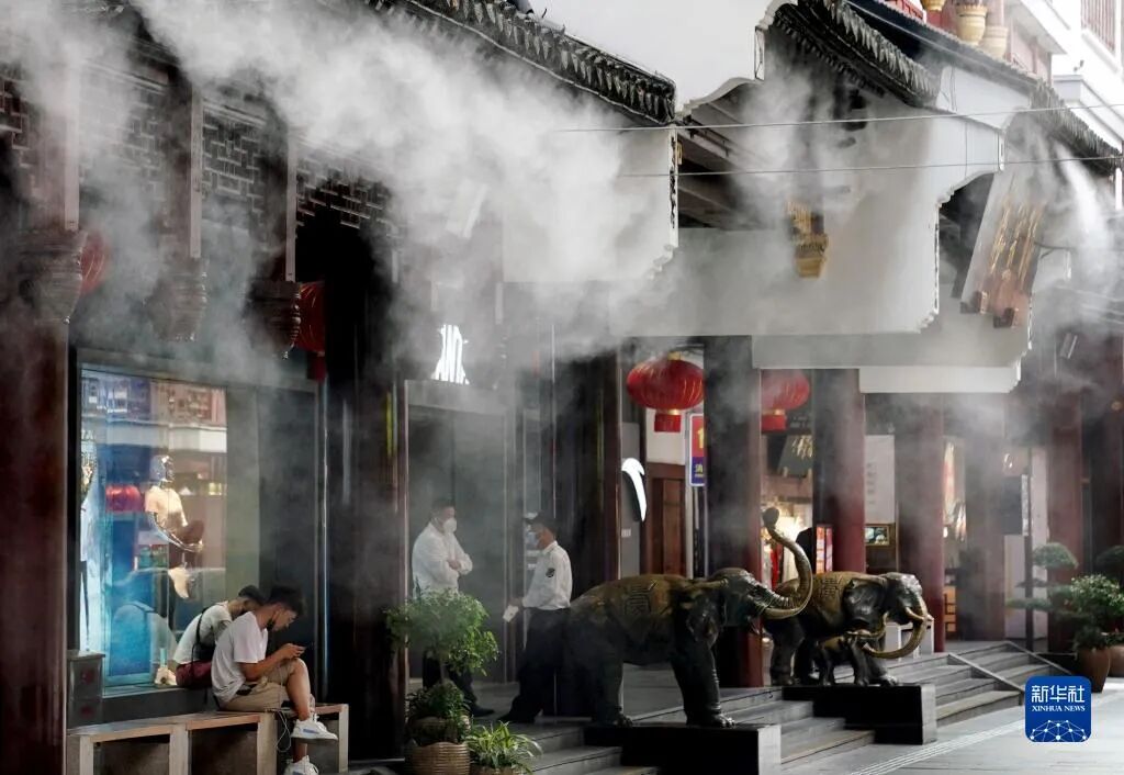 7月14日,上海豫园商城启用喷雾装置进行防暑降温。当日,上海中心气象台发布今年第3个高温红色预警信号,最高气温超过40摄氏度。新华社记者 刘颖 摄