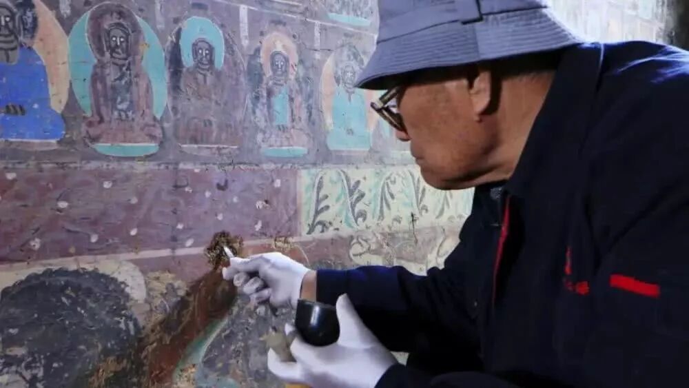 细心清理壁画表面尘土,在起甲处注入高分子粘合剂,再将壁画贴回原处。这项看似简单的操作,李云鹤已经重复了60多年。