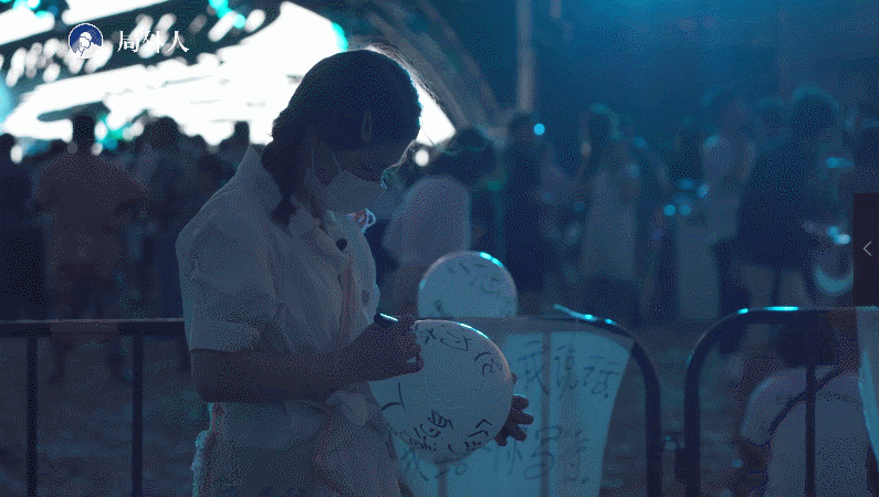 但这一场实验,也有个小小的意外之喜:当隔花人在现场闲着没事时,就开始在自带的气球上写一些新旧诗歌,然后绑在海边的一个舞台架子上。
