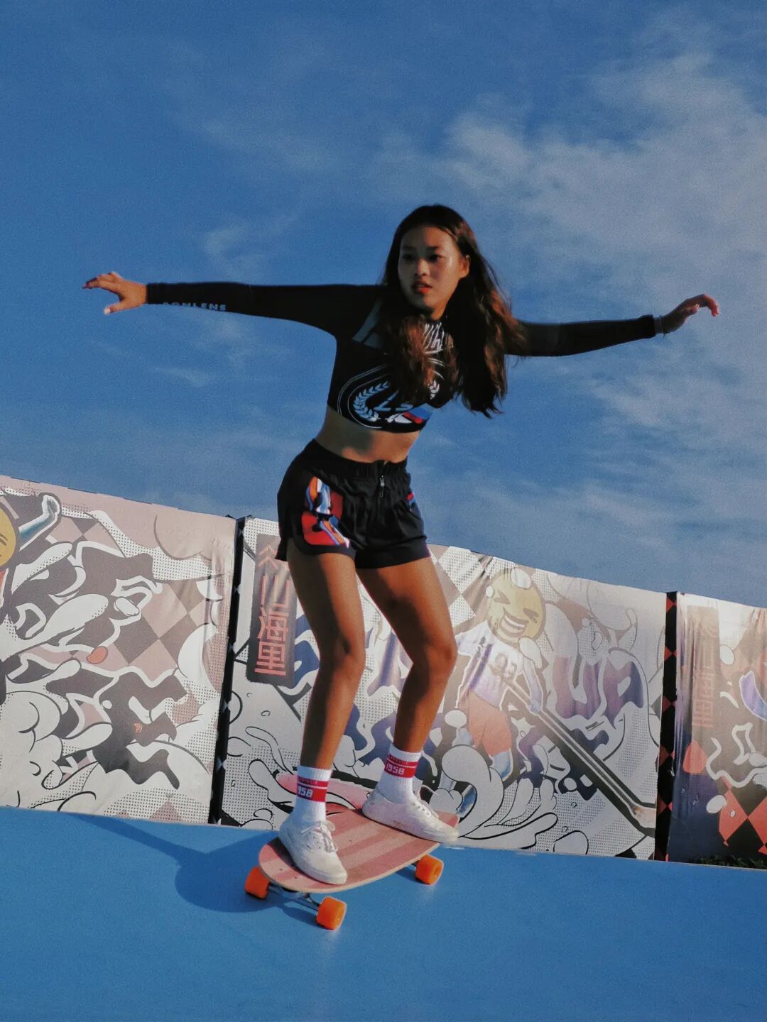 之所以会快速“冲浪上瘾”,和佳佳一直对极限运动的喜爱不无关系。初中时流行玩死飞、玩双翘滑板,这个大胆自信的cool girl就冲在冒险的前线。为什么喜欢街头运动呢?佳佳觉得,相比于局限在固定空间、目的性较强的健身房撸铁,她更喜欢有体验感的东西,而极限运动很大的魅力,正是那些溢出“锻炼身体”本身的东西: