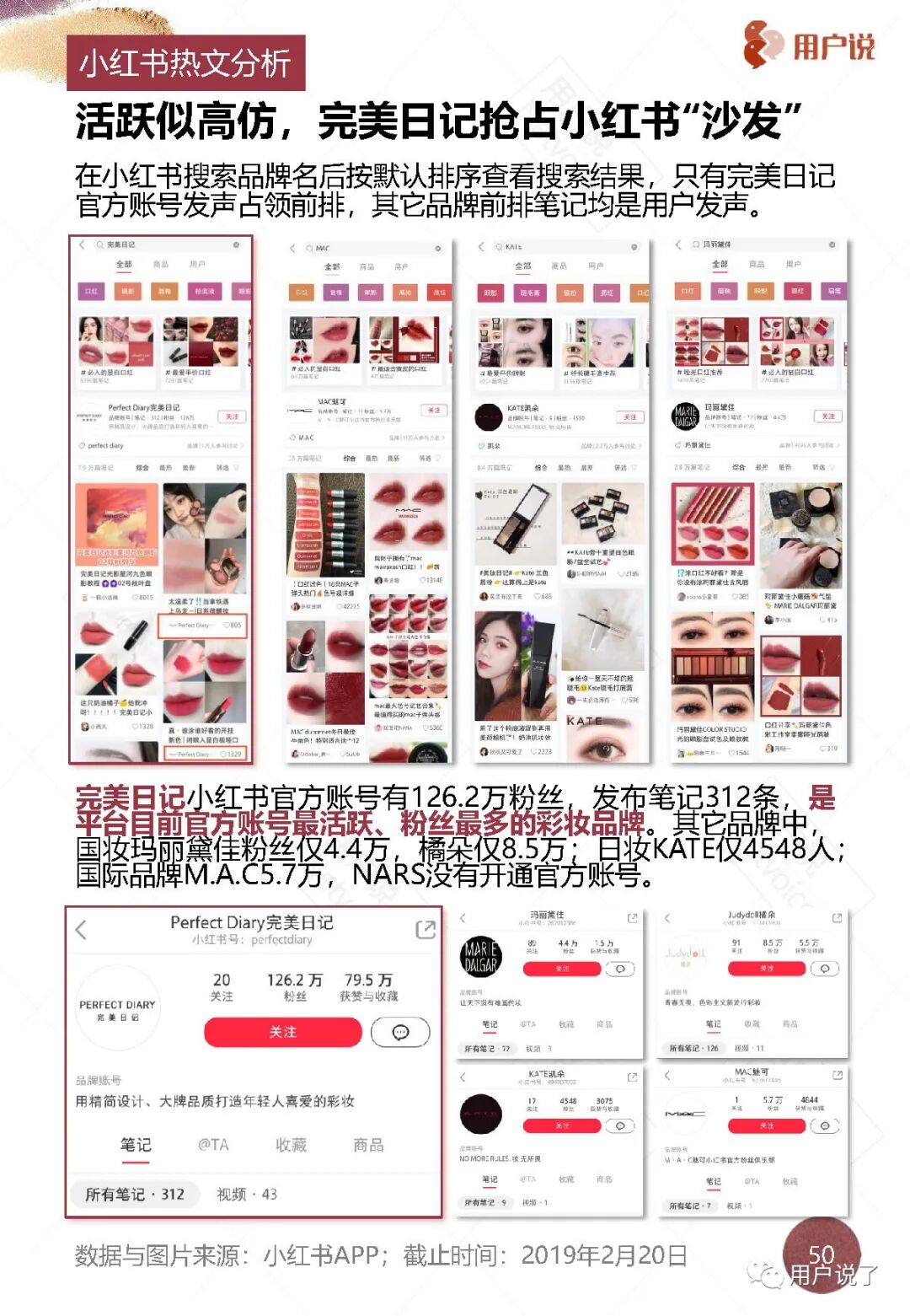 2018年8月以后,完美日记被更多人注意到之后,小红书成为很多新锐彩妆品牌重点投放阵地,也有不少品牌考虑到ROI的不定性而还在观望。但在当时,完美日记在小红书上已经圈住了大量粉丝,其官方账号的粉丝数、获赞与收藏数第一的宝座至今没有品牌可以超越。