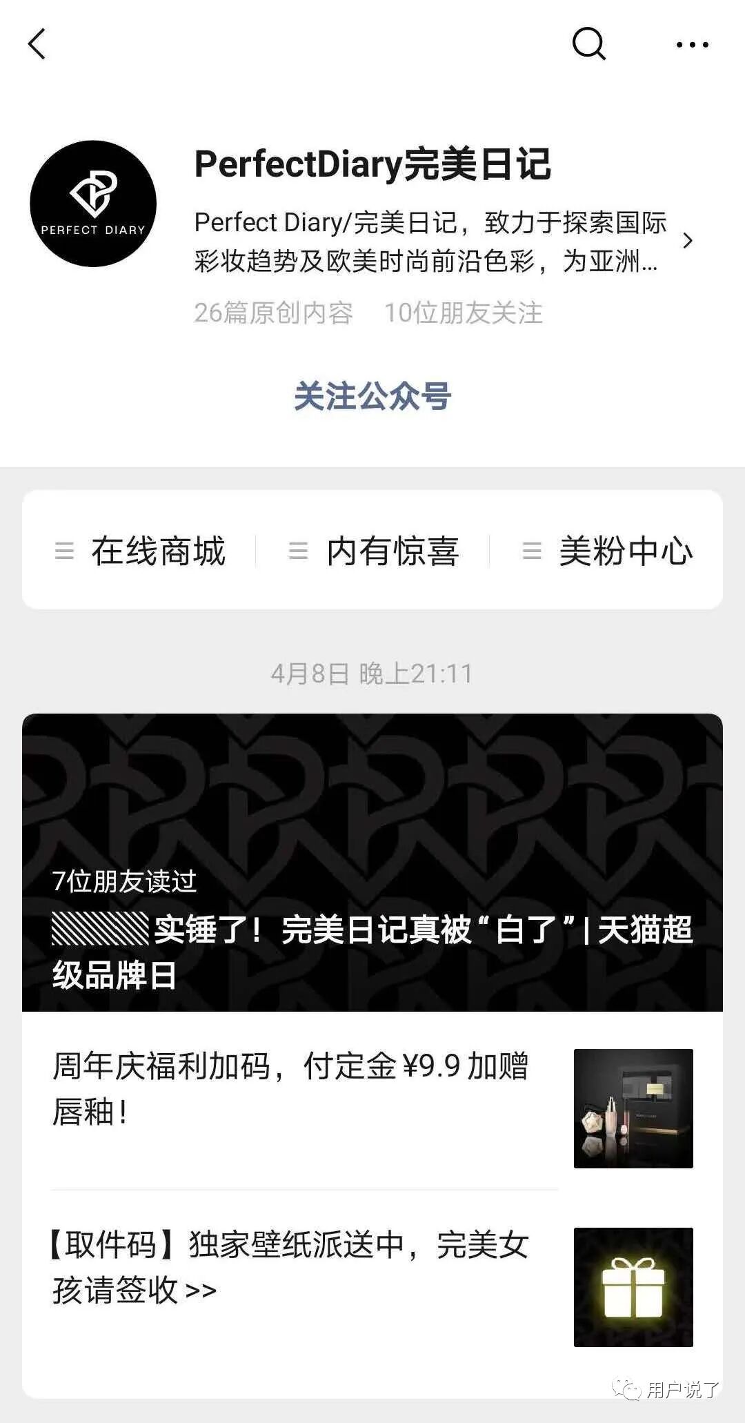 完美日记对用户进行分类并有针对性分发内容主要有两个层面,首先就是其微信公众号和小程序矩阵,一起感受一下: