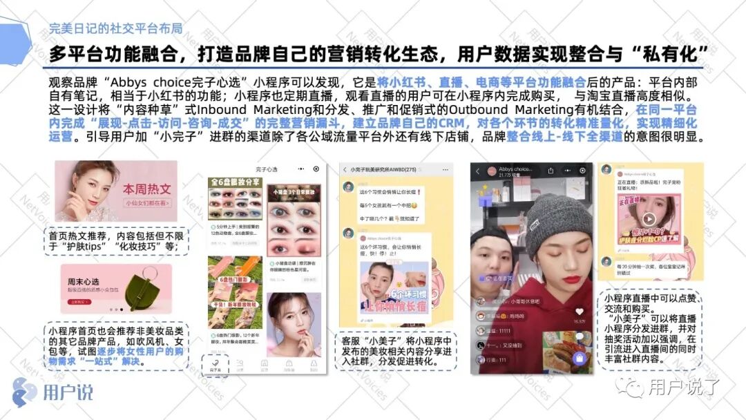 目前,完美日记在微信生态内尝试了社群运营、内容分发与用户裂变之后,又成为最早参加微信直播内测的商户之一,从而在实践中完成了直播与社群运营等各种功能的协同,形成了自己的一套运营方法和分工。