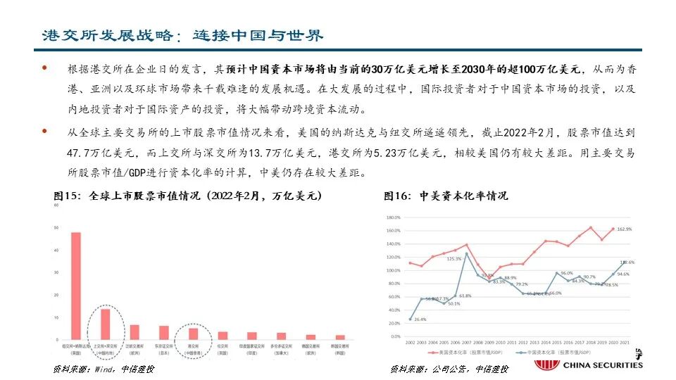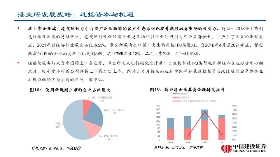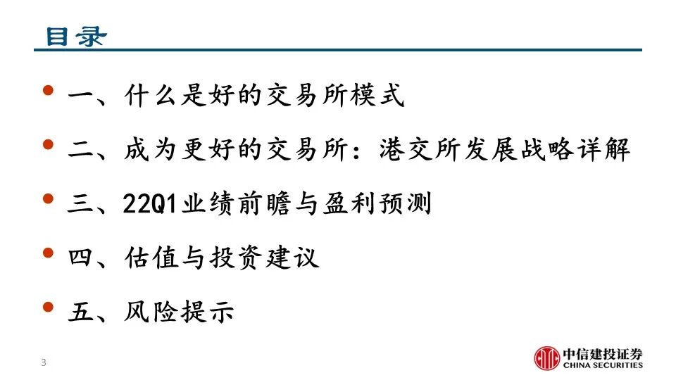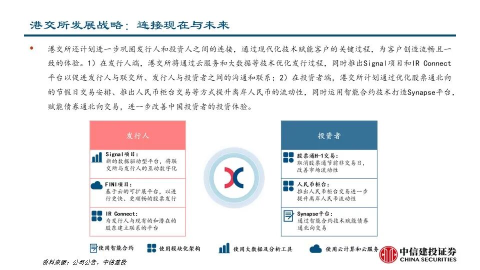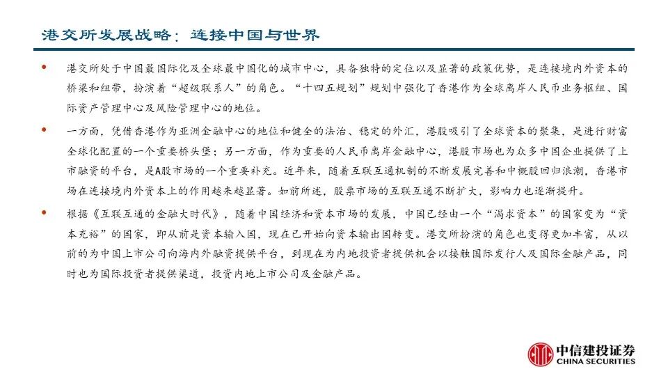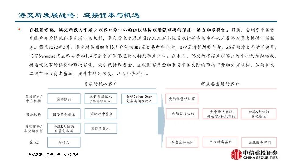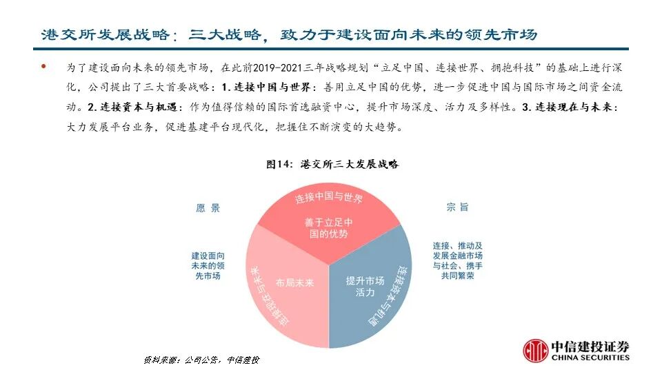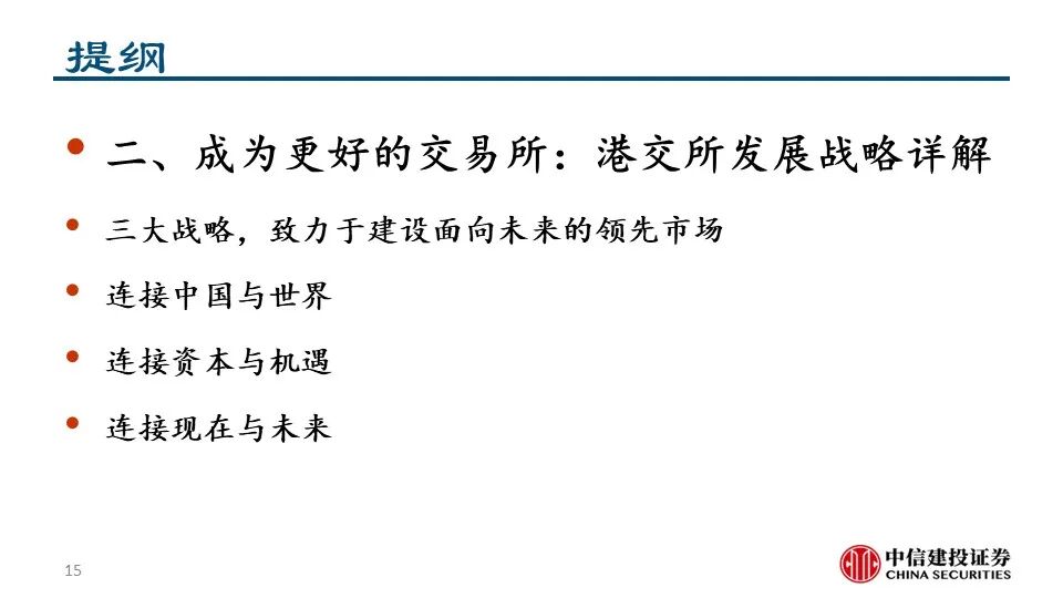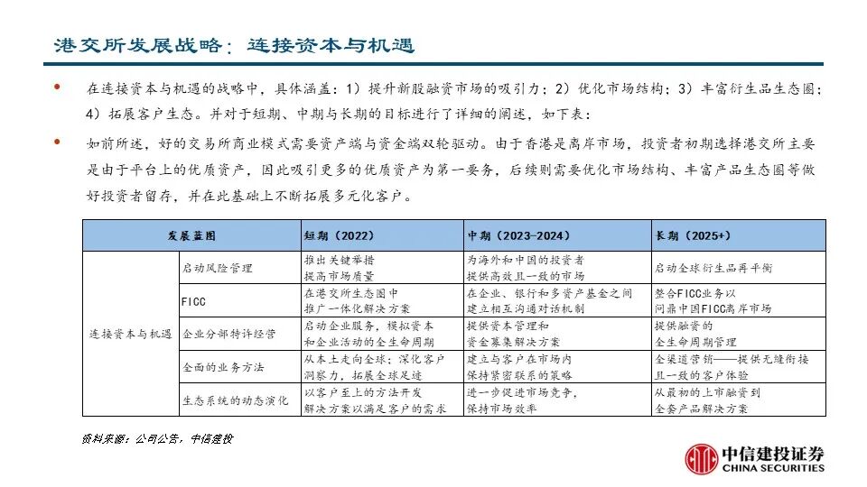 •为了成为更好的交易所,港交所在企业日提出了三大战略,致力于建设未来的领先市场。1)连接中国与世界:拓展及提升互联互通趋势;成为中国首选的离岸风险管理中心;巩固“中国首选离岸融资中心”地位;丰富中国相关产品组合。2)连接资本与机遇:提升新股融资市场的吸引力;优化市场结构;丰富衍生品生态圈;拓展客户生态。3)连接现在与未来:推动基建平台现代化建设:加强核心平台建设、提供平台间无缝访问;从基础设施主导模式演变为客户主导模式:创造客户旅程、调整运营模式。