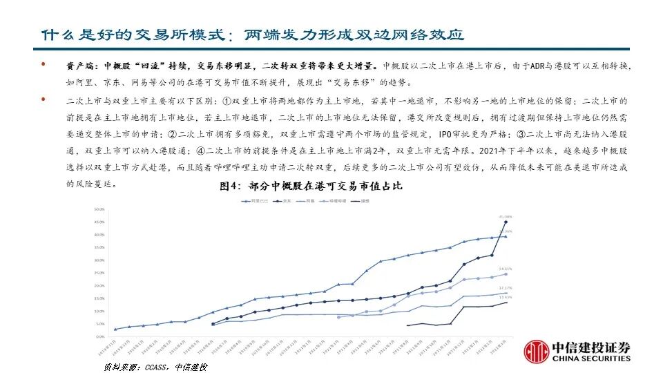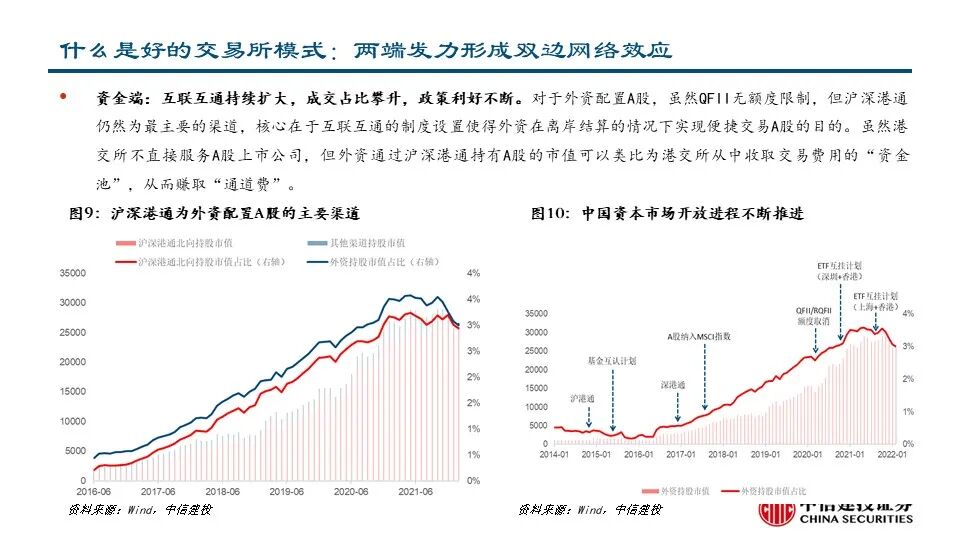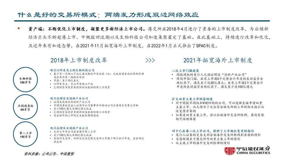 •我们认为,好的交易所模式需要:1)资产端与资金端两端发力形成双边网络效应;2)提供高效撮合平台,本质上是由投资者吸引更多的投资者,流动性吸引更大的流动性;3)现货、衍生品与商品市场齐全,市场之间产生协同效应;4)上市、交易、结算等变现方式增多,垂直产业链不断延伸,变现效率提升。港交所在这四点上都做了很多努力,整体呈现持续优化的态势,尤其是变现能力领先全球。