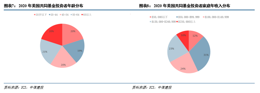 美国共同基金投资者以处于工作年龄的35-64岁人群为主,平均年龄50岁,有较高的储蓄意愿与投资需求。根据2020年的ICI调查报告,美国共同基金投资者以中老年和中高收入群体为主,平均年龄50岁,平均税前年收入14.5万美元。2020年美国60%的基金持有者年龄在35-64岁之间,其中35-44岁、45-54岁、55-64岁分别占比19%、20%、21%,35岁以下和65岁以上的投资者占比均为20%,平均年龄为50岁。各年龄段基金投资参与率方面,35岁以下人群中有46%参与共同基金投资,35-64岁的人群中约52%参与基金投资,而65岁以上的人群中进行基金投资的仅占比34%。美国人口统计数据显示2020年美国65岁以上的人群占比27%,受人口结构影响,共同基金投资者中65岁以上的占比不低,但由于处于生命周期的末期,财富处于消耗阶段,因此不管是投资参与度或资产规模都不及35-64岁的人群。在美国,35-64岁的人群处于工作年龄,收入与财富积累度都处于顶峰,养老需求与资产增值需求较高,成为共同基金投资的主力军,因而这部分人群的投资行为会更大程度影响共同基金市场。