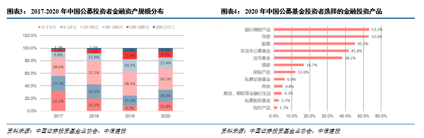 高净值客群增长明显更为强劲,近三年金融资产100万以上投资者占比翻倍。数据显示,2020年金融资产规模低于50万元的个人投资者比例为68.3%,其中金融资产规模在10到50万之间的占34.2%;金融资产超过50万元的人群中,超过300万的占5.0%,100万到300万之间的占9.3%,50到100万之间的占17.4%,近五年来金融资产50万以上的高净值人群占比呈现稳步增长的趋势。