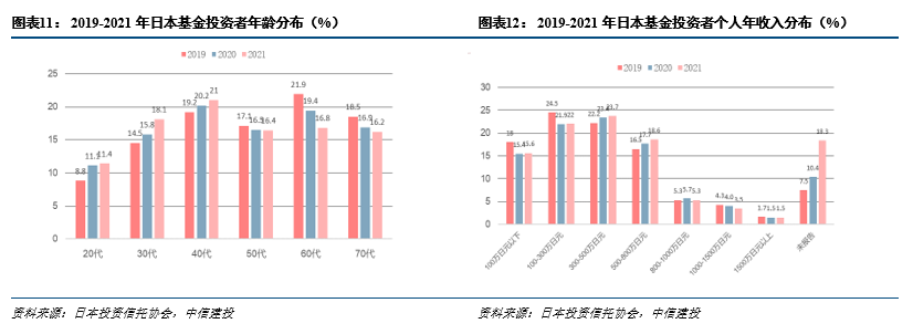日本基金投资者主力是个人年收入在800万日元(约合人民币48万元)以下,年龄20-59岁的中青年。与中国相比,日本投资者年龄结构更为均衡,信托的国民认可度与参与度更高;年龄分布趋势与中国相反,有年轻化趋势;收入分布与中国相似,小康与中产家庭是投资主力,高净值人群增长潜力大。