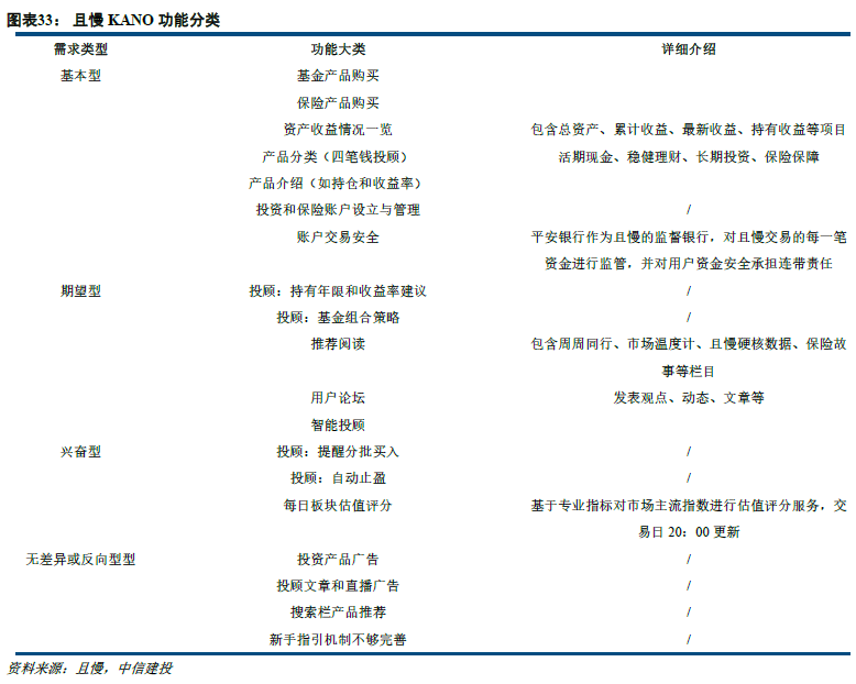 功能特性上:天天基金对用户期望型和兴奋型需求满足程度最高,蚂蚁财富期望型占优,理财通各项均衡但丰富度不足,爱基金以基本型和期望型为主,且慢对兴奋型需求满足程度较高。1)天天基金:需求满足程度均衡且完善,期望型和兴奋型功能丰富;2)蚂蚁财富:期望型功能占优,更好的满足了特定人群的特定需求;3)腾讯理财通:基本型、期望型、兴奋型功能占比均衡,但丰富度略显不足;3)同花顺爱基金:侧重于提高兴奋型需求的满足程度,但目前仍以基本型和期望型为主;4)且慢:兴奋型需求满足程度最高,极致简洁突出投顾交互。