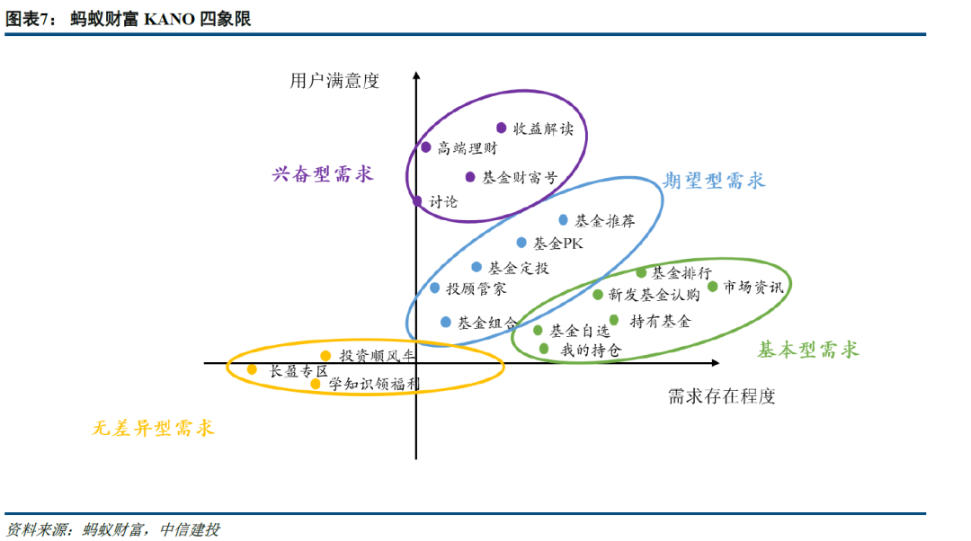 基金销售APP为投资者提供了集基金交易、投顾服务、产品比较、社区讨论、学习理财等为一体的功能平台。从商业模式看,在线基金销售不过是流量聚集再分发的变现,自有基金代销以来,诸多公司都曾布局过线上场景,模式表面类似的情况下发展方向大相径庭。因此,我们猜想线上销售的能力一定有其独特壁垒,以传统投研思维去分析恐怕难以深入,所以我们采用KANO模型对保有量排名较为靠前的2C互联网代销平台进行对比。