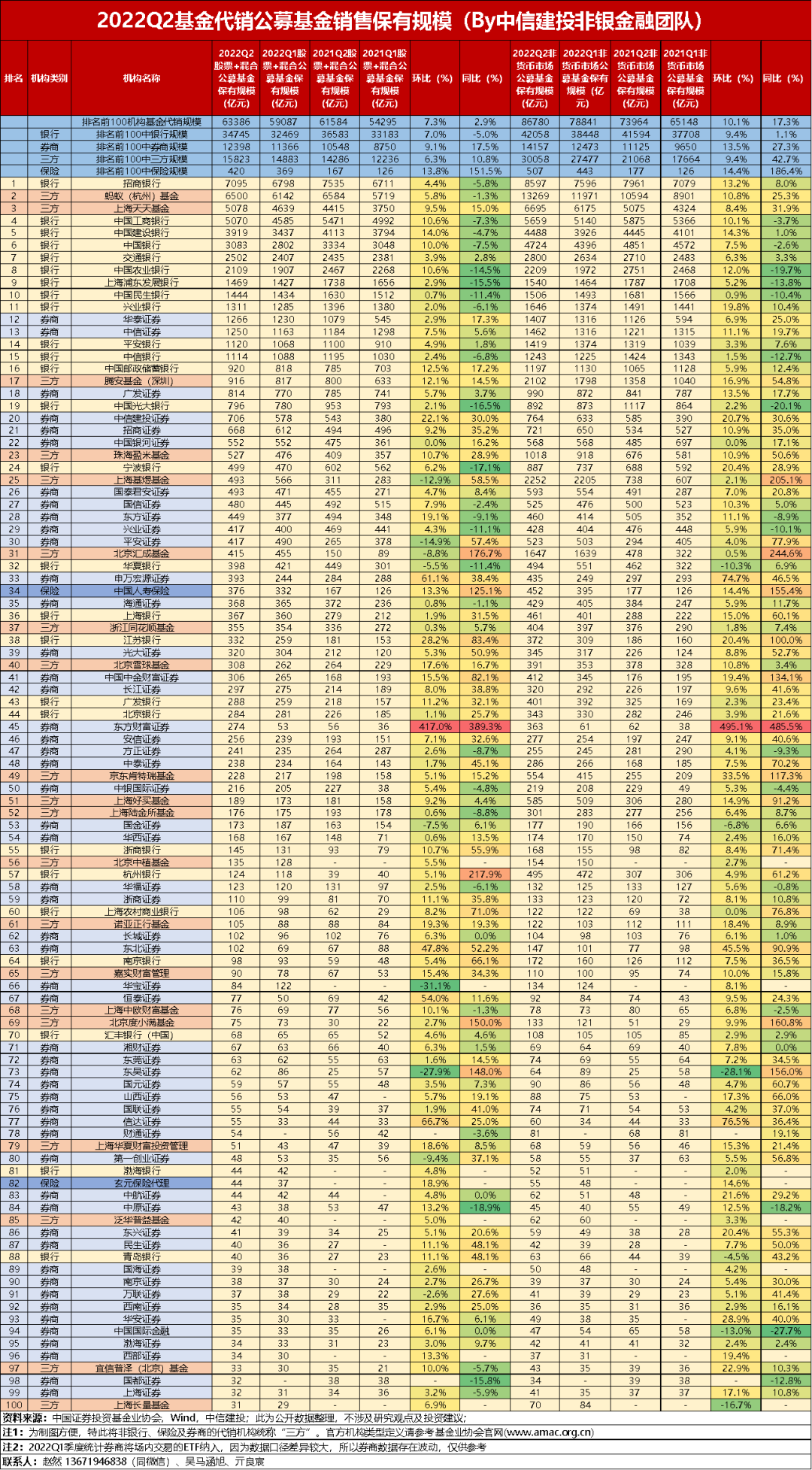 银行的股票+基金代销保有规模仍占行业主导地位,但同比收缩。截至2022Q2银行股票+混合公募基金代销保有规模为3.5万亿元,占排名前100机构的54.8%。受二季度权益市场回暖等因素影响银行股票+混合基金保有量环比回升7%,但同比-5%,规模相较去年同期出现收缩。