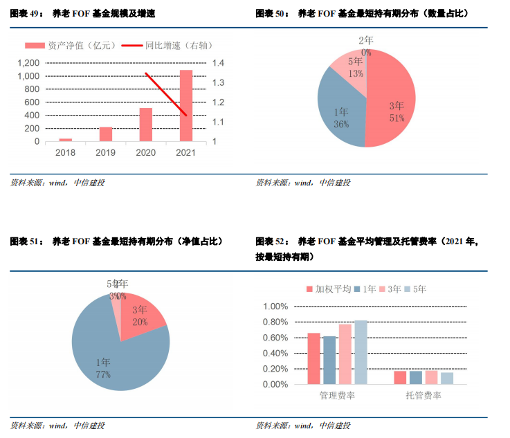 养老基金:主要为FOF基金,发展十分迅速。受政策限制国内养老基金以养老FOF基金为主,产品形式上划分为目标风险型和目标日期型两类。相较养老理财产品而言国内养老FOF发展相对较早,公募养老FOF首只产品成立于2018年9月,首只公募养老FOF产品正式发行于2018年8月。自2018年来国内养老FOF基金发展十分迅速,根据wind数据统计,至2021年末规模已突破千亿,2020年和2021年养老FOF规模增速分别达135%、113%,增长十分迅速。从投资类型来看,以截至2021年底数据统计国内养老FOF基金均为混合型,产品期限上公募养老FOF基金期限相较养老理财较短,数量上来看全市场公募养老FOF产品以三年持有期产品为主,数量占比达50%,其次为1年期36%,五年期13%,而目前发行养老理财产品实际天数均在5年及以上。风险偏好上来看公募养老FOF基金同样较银行理财较高,现有市场中所有FOF养老基金风险等级均为三级,为中风险水平。费率方面公募养老FOF基金相较银行理财较高,以基金规模加权计算,截至2021年国内养老FOF基金加权平均管理费率0.66%,托管费率0.17%,由于FOF基金的两道收费模式,目前国内养老基金费率远高于养老理财产品。