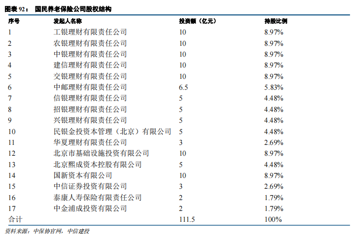 由工银理财等17位发起人合资设立的国民养老保险公司也是我国第三支柱发展路上的一个重要尝试。国民养老保险公司2021年8月18日逆成立,9月2日银保监会批准其筹建,9月8日,中保协官网公布《关于拟设立国民养老保险股份有限公司有关情况的信息披露公告》,根据公告,国民养老保险公司注册资本高达111.5亿元,其业务既包括短期健康保险业务、意外伤害保险业务、团体人寿保险业务、团体长期健康保险业务、个人长期健康保险业务等传统业务,也包括商业养老计划管理业务、受托管理委托人委托的以养老保障为目的的人民币、外币资金、团体养老保险及年金业务、个人养老保险及年金业务等第三支柱业务。从股东背景可以看出,无论是从数量上(10家)、还是持股比例上(合计持股66.81%),银行系理财子公司都占据主要地位,该公司的成立可以视作银联体对国家发展第三支柱有关政策的一个积极响应。可以预计未来我国第三支柱将得到良好发展。