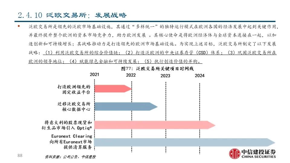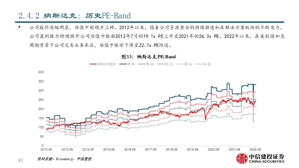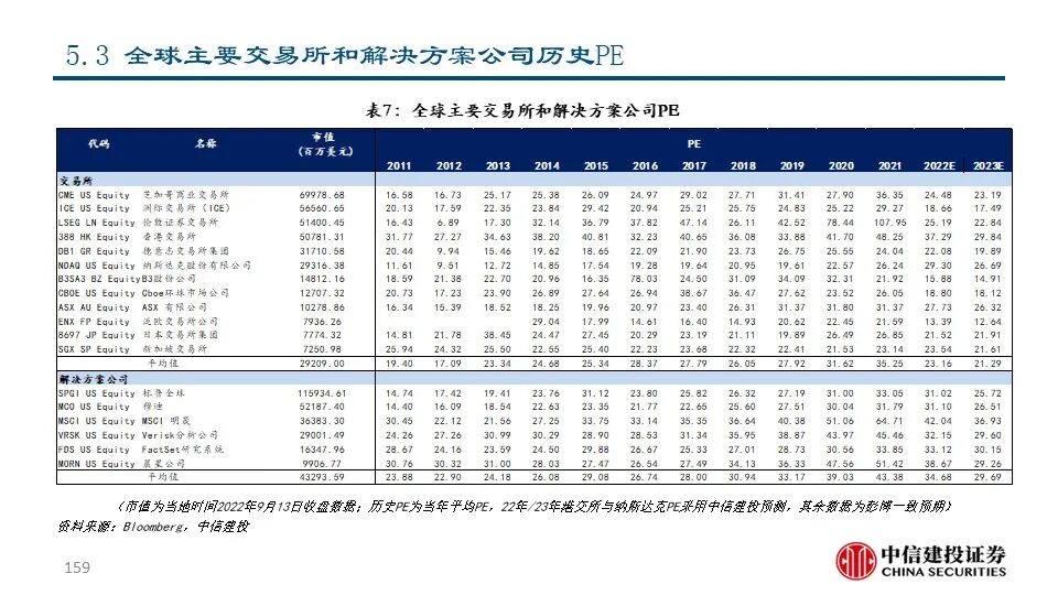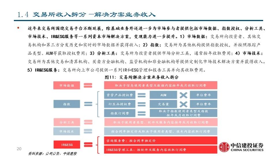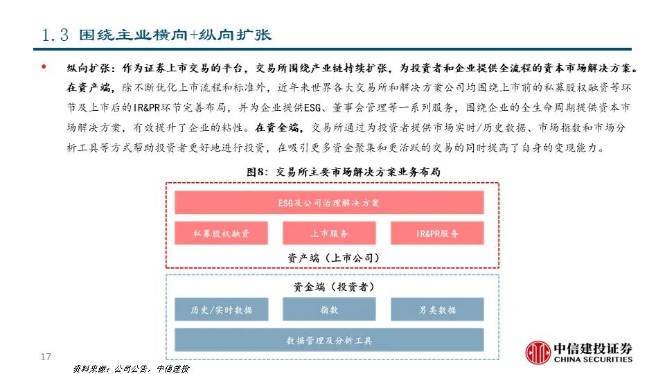 我们认为,交易所具有发展解决方案业务的先天优势和天然动力。交易所作为证券交易的平台,天然积累了资产端和资金端的双向流量和伴随着交易活动产生的海量数据资源。1)交易所具有发展市场数据分析和市场服务的资源禀赋优势和客户基础,通过深度数据服务进一步提升平台粘性;2)交易所不断进行技术迭代,有助于其巩固平台优势甚至进行技术输出;3)交易所提供的完善的资本市场解决方案反过来可以促进投资者进行交易并吸引公司上市,从而产生飞轮效应并对交易所主业产生助力。