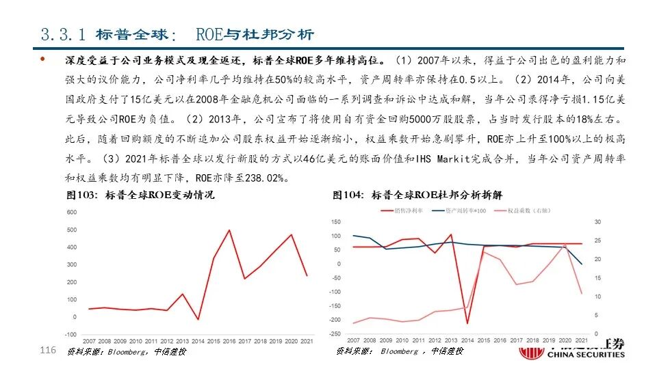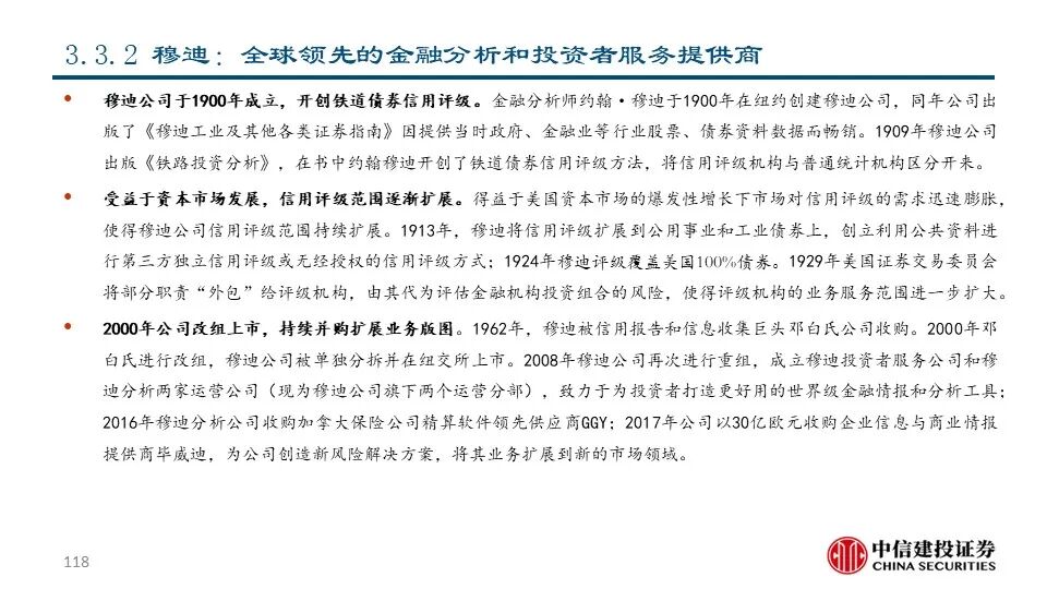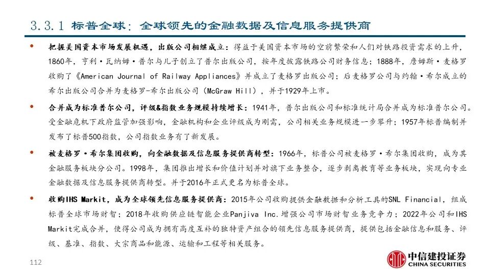 ②穆迪(MCO US Equity):公司成立于1900年,是全球领先的金融分析和投资者服务提供商,市值达521.87亿美元。早在1924年穆迪评级就已覆盖美国100%的债券;近年来公司通过收购企业信息与商业情报提供商毕威迪将其业务扩展到新的解决方案市场领域。2021年,公司共实现营收62.18亿美元,同比+15.77%;其中包含评级服务在内的投资者服务业务和包括金融数据、分析工具和研究服务的分析业务分别占比61%和39%。