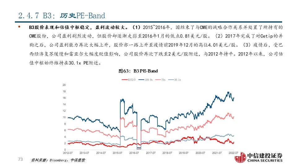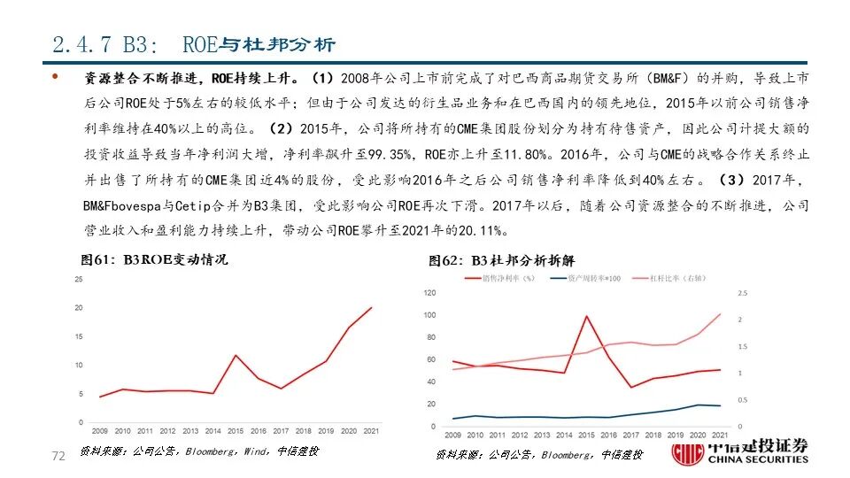 ⑦B3(B3SA3 BZ Equity):公司最早可追溯到1890年成立的圣保罗证券交易所(Bovespa),通过一系列的兼并整合成为拉丁美洲最大的交易所集团,目前市值达到148.12亿美元。2021年,公司实现营收17.17亿美元,同比+4.56%;其中包含上市证券及衍生品的挂牌上市、交易、清算等在内的上市证券分部占比达68.78%,是公司的主要收入来源。