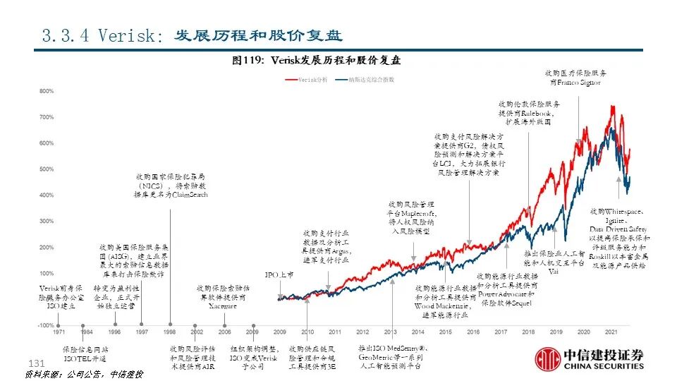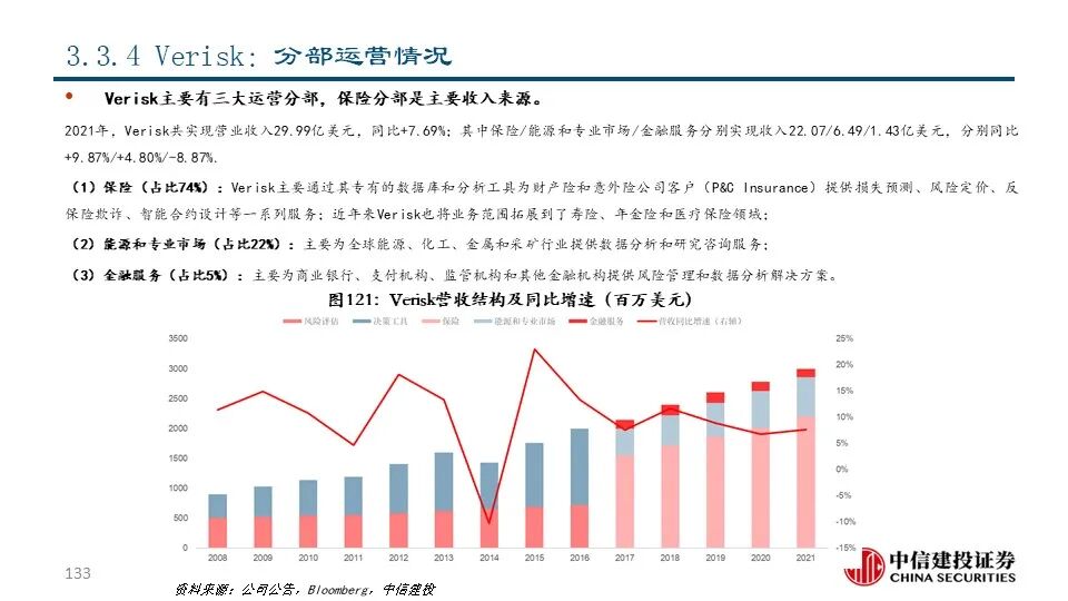 ④Verisk(VRSK US Equity):公司前身为是1971年成立的保险服务办公室(ISO),目前是全球领先的风险管理解决方案提供商,市值达290.01亿美元。公司通过其专有的数据库和分析工具为保险公司客户提供损失预测、风险定价等一系列服务;近年来,Verisk将原有的风险管理资源和优势拓展到能源、银行等新领域。2021年,公司共实现营收29.99亿美元,同比+7.69%;其中保险分部占比73.60%,是公司的主要收入来源。