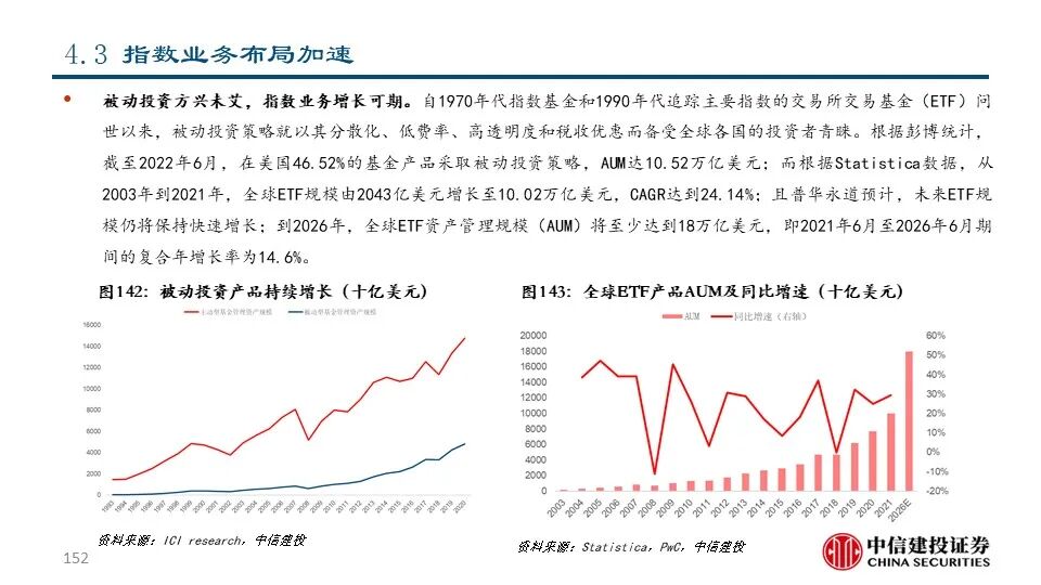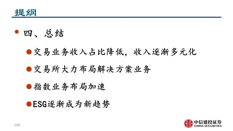 我们发现,近年来交易所和解决方案公司围绕投资者的关键流程为其提供一系列金融信息、分析工具及研究服务等解决方案,从而为投资决策赋能。具体来看,交易所和解决方案公司的业务布局呈现出以下趋势:1)沿着数据生产、数据处理、数据整合等产业链环节进行纵向扩张和资源整合;2)顺应被动投资浪潮,积极拓展指数业务;3)持续推出ESG治理和相关解决方案以满足人们对ESG日益重视的需求。