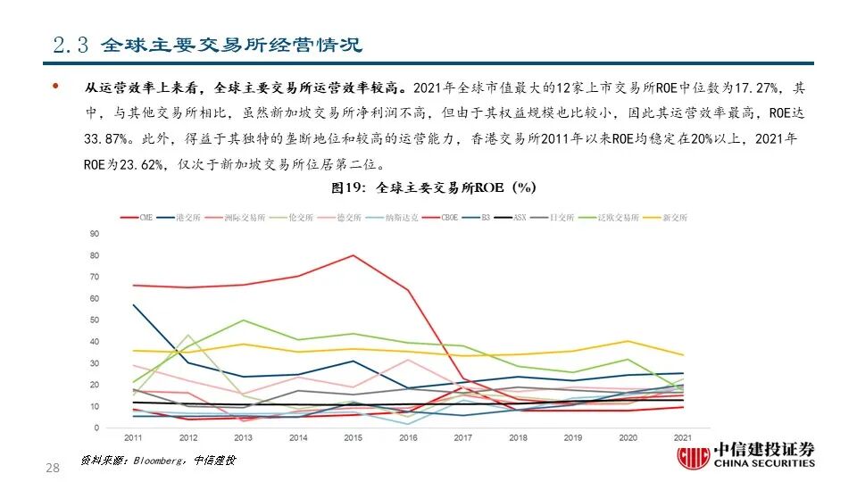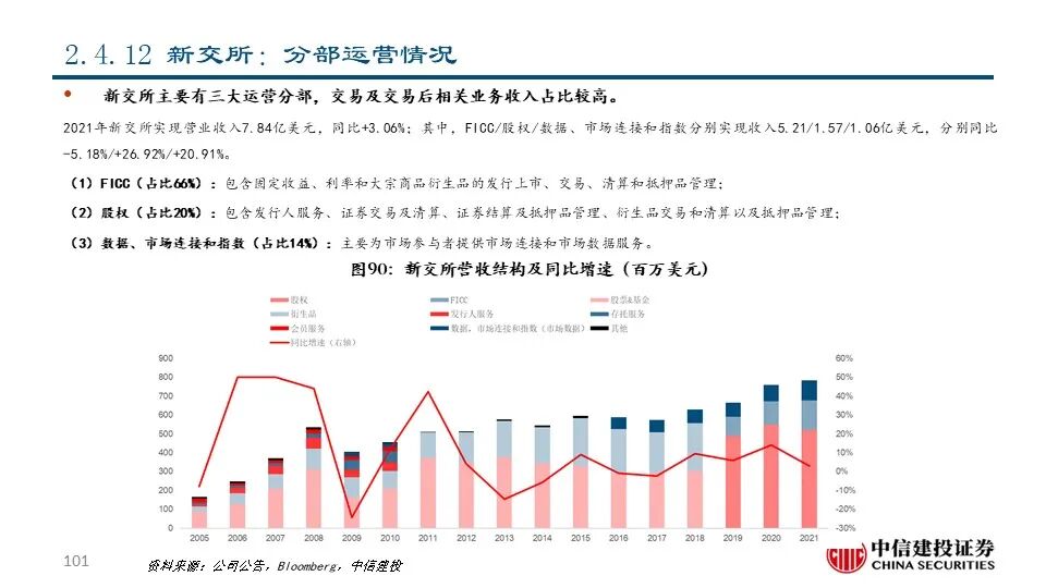 ⑫新交所(SGX SP Equity):公司成立于1973年,是亚洲最国际化的多资产交易所,市值达72.51亿美元。经过二十余年的发展,公司的交易资产类别已包括股票现货、股权衍生品、大宗商品、外汇、固定收益、基金等,为客户一站式整合服务,并成为了连接亚洲和世界的窗口。2021年公司实现营收7.84亿美元,同比+3.06%;其中,与交易和交易后服务相关的FICC和股权两大运营分部分别占比66.39%和20.05%。