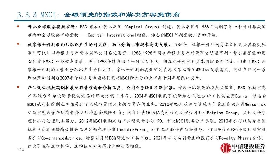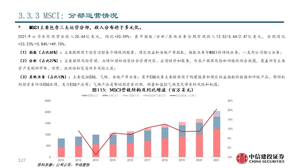 ③MSCI(MSCI US Equity):公司最初由资本集团创建并于1968年开始编制指数,于2007年从摩根士丹利分拆上市后成为全球领先的指数和解决方案提供商,目前市值达363.83亿美元。2021年公司实现营收20.44亿美元,同比+20.54%;其中指数业务收入占比61.25%,是公司的主要收入来源。