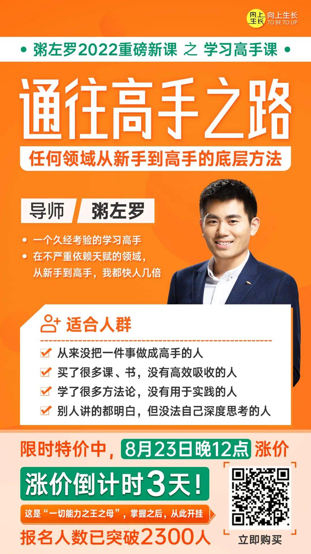 1. 我把我所有的学习方法,都系统全面的总结在了这门课中,这是任何领域从新手到高手的底层方法论,是我卖的最快的一门课,已经有2300+人报名学习。感兴趣,可以先扫码看看课程大纲。