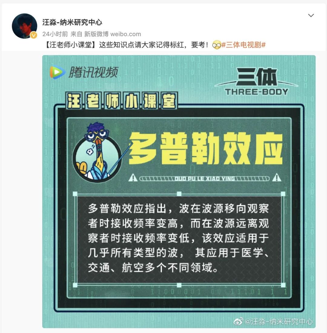 清华、复旦、中科院高能所、纳米中心、气象局、天文馆这些应该不必介绍了。中国卫通集团,是中国航天科技集团下属子公司,我国唯一拥有通信卫星资源且自主可控的卫星通信运营企业。悟理学院,是中科院物理所长三角中心的科学传播平台。个人顾问中,追剧的小伙伴们也纷纷表示从中看到了熟悉的名字。魏红祥,中国科学院物理研究所研究员,经常出现在各大科普活动中,还是2020年的“十大科学传播人物”获得者。王元卓,中科院计算所研究员,也是长期致力于科普。刘慈欣另一部改编作品《流浪地球》电影上映后,他凭借几张为女儿普及电影中知识的手绘图走红,被大家称为“硬核科学家奶爸”。国家天文台研究员苟利军,带领团队对人类发现的第一个行星级黑洞“天鹅座X-1”作出了精确测量并登上《Science》,被称为“给黑洞‘画像’的人”根据知乎用户@东风渐起的分享,刘倩老师主要负责对接和解答剧组的疑惑。看看刘倩老师给剧组的资料之详尽,最后能拍到这种程度也就不奇怪了。在剧中角色汪淼的微博账号上,每天都会有针对当天播出内容中的小卡片。在后面未播出的剧情中,还会有不少与科学相关的名场面。比如三体游戏中的人列计算机,由士兵组成逻辑门执行二进制计算。再比如“古筝行动”,也就是汪淼研究的纳米材料“飞刃”进入实战(更多的就不剧透了)。03