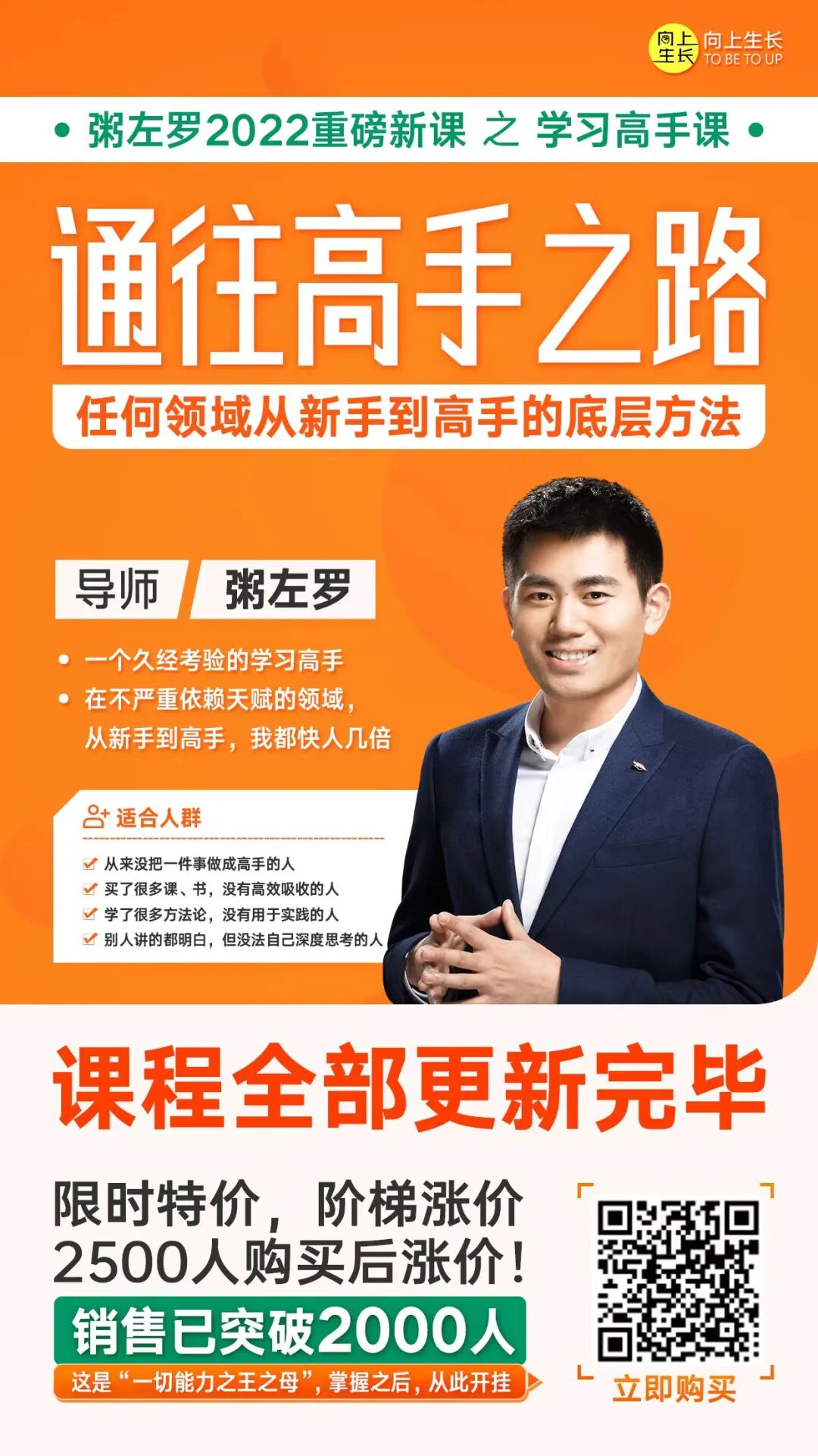 任何事情,想要做成高手,都必然会经历困难和痛苦。但如果你扛过去了,你就一定会知道如何面对相似的困境。作为一名久经考验的学习高手,我把我过去在不同领域,从新手到高手的底层方法,整理成了一套系统、全面、透彻的课程。如果你还没把一件事做成高手过,如果你还想改变,欢迎扫码报名👇![]()