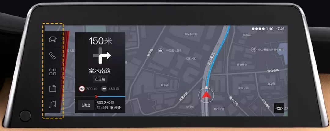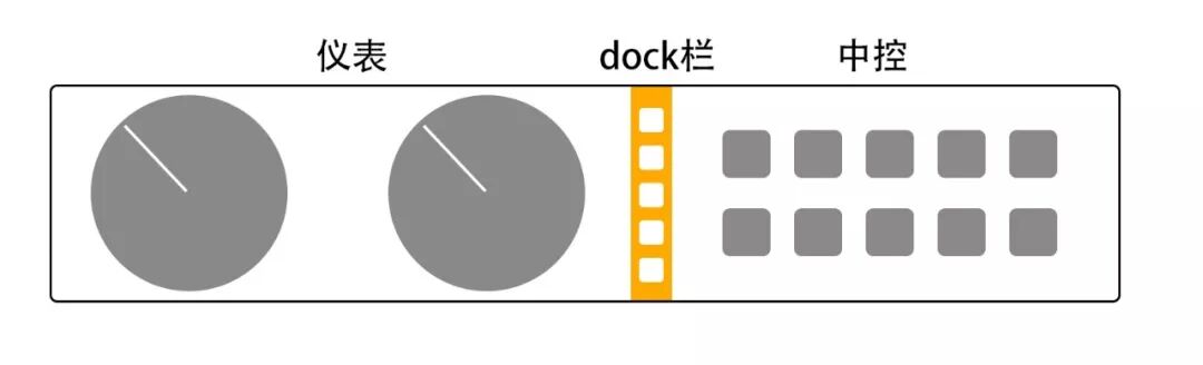 以奔驰的中控屏为例,曾经它是独立的悬浮屏,但逐渐的中控和仪表连成了一字屏,并且在后续的车型中,可能整个前排屏幕都连成了整块的一字屏,所以在中控屏的平台化交互设计时,要预想到以后的全貌,按照全貌的方式来设计,以预防因为当下不够远见的交互架构设计,与后续的屏幕发展方向相悖。 举个反例来说,如下图所示,如果在横的中控屏中,把dock栏竖直放在左侧,那么在中控与仪表连成一体的时候,dock栏是非常尴尬的,它会切断整个一字屏的连续性。