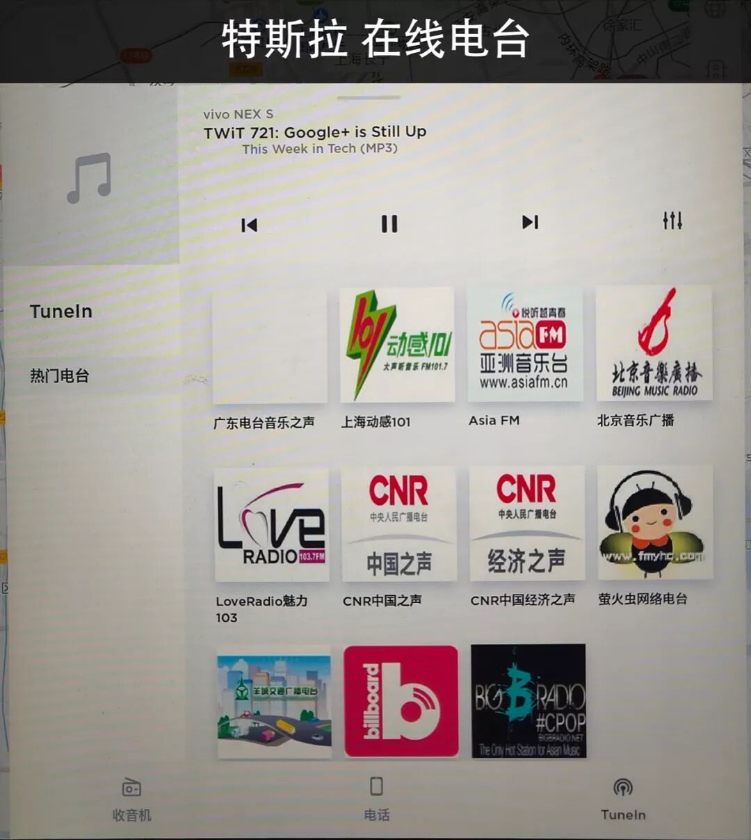 主机厂通常需要就相同类型的内容而引入多家CP/SP,比如音频类内容,引入QQ音乐、酷狗音乐、喜马拉雅、考拉FM等等,主机厂一般会要求第三方在交互设计层面做定制,而对于CP/SP而言,如果每个主机厂都提供一个定制的版本,研发成本和维护成本都是非常高的。为了解决这类矛盾,主机厂可以针对同类的内容建立相同的交互架构,然后直接通过API的调用来接入各个CP/SP的内容即可。这样既帮助主机厂获取了对交互体验的掌控力,又帮助CP/SP大幅降低了适配成本。下图是特斯拉9.X的系统的举例,对于不同音频内容的界面处理: