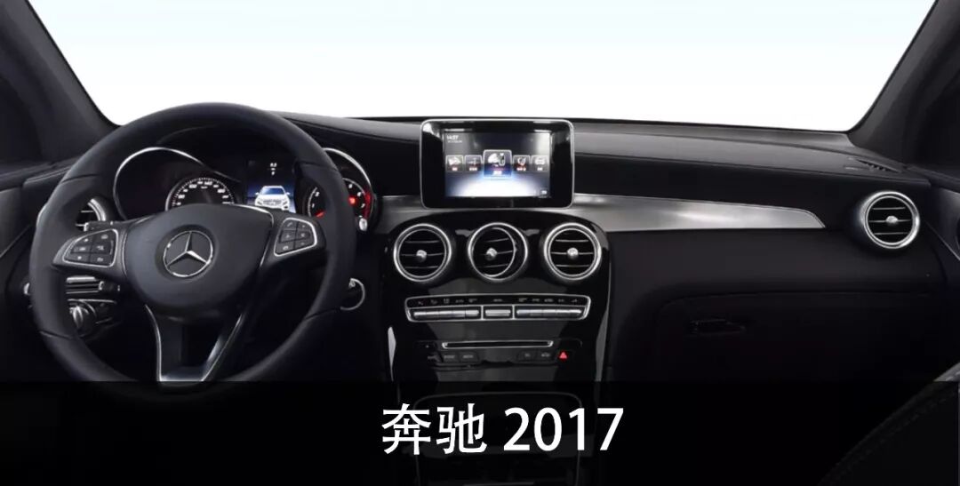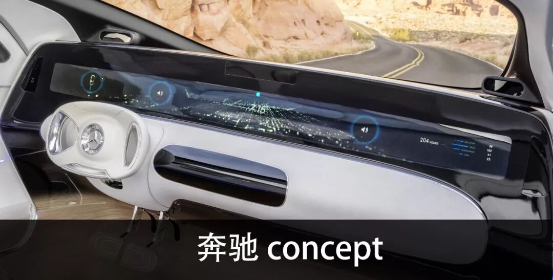 就目前的趋势而言,汽车HMI的交互窗口任然在持续的增加,因此如果我们要设计一套有生命力的HMI交互架构,就必须充分考虑到可见的N年内交互窗口的完全体状态(比如中控、仪表、HUD、空调屏、副驾屏、乘客屏、后视镜屏、全车语音、车外屏等等),然后基于这种最大化的完全体状态进行当下平台化的交互设计,以奔驰的前舱举个例子,如下图所示,分别是奔驰2017年车型,2019年车型和未来的概念车型: