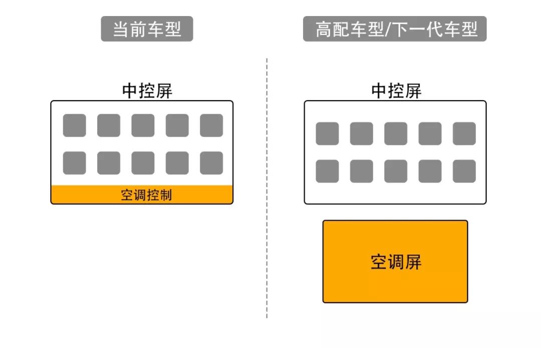 举个例子,如下图,在平台化设计的时候,将空调的入口加入中控屏中,如果在更高配的车型中增加了一块空调控制屏,则直接把中控屏中的空调入口移除即可。
