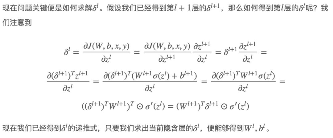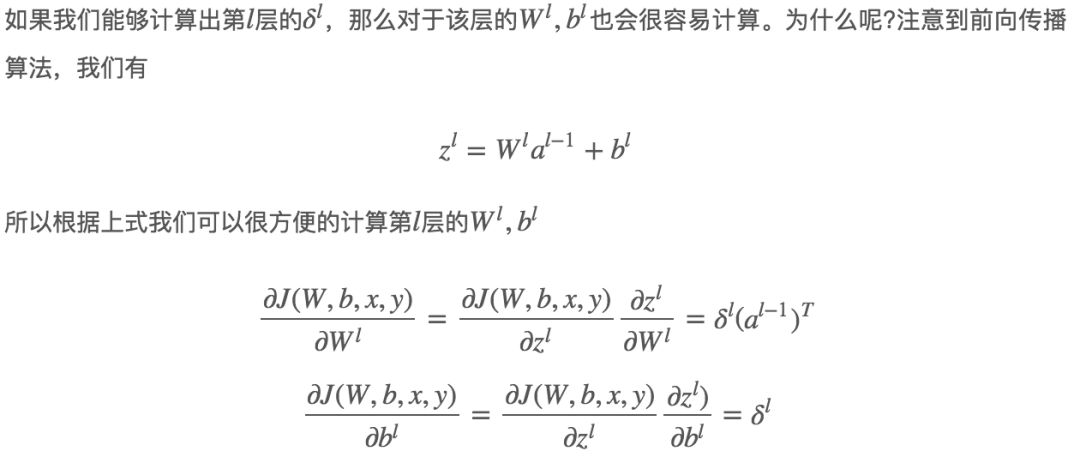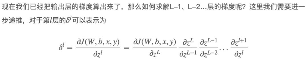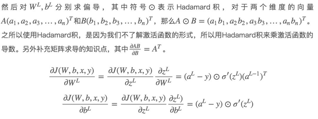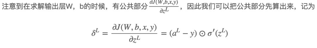 通过损失函数,我们能够用梯度下降法来迭代求解每一层的W,b。首先计算的是输出层,其中输出层的W,b满足下式