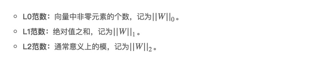如果从X入手解决问题,但训练过程中我们不知道下一个样本X是什么,会怎样的影响目标函数,所以此路不通。那么W如何呢?我们知道W系数是训练过程中通过学习历史数据得到的,和历史数据有关,所以应该可以。现在再回到我们原来的问题,希望减少N的数目,而让N最小化,其实就是让X向量或W向量中项的个数最小化,既然X不行,那么我们可以尝试让W向量中项的个数最小化。如何求解才能让W向量中项的个数最小,我们先简单介绍下0、1、2范数的概念。