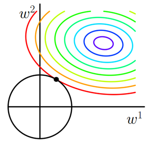 可以看到在梯度下降算法过程中,w是不断进行减小的,也就是权重衰减,这样也就能得到一个让所有参数都比较小的模型,也就能解决过拟合问题。最后再解释下为什么L2正则化不具有稀疏性的原因,如下图所示,二维平面下L2正则化的函数图形是圆,与L1图形相比,没有了菱角。因此J0与L2接触时,使w1或w2等于0的机率就小了很多,所以L2正则化不具有稀疏性。