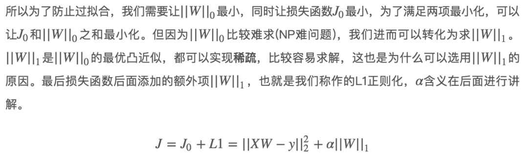 从上图可以看出,当J0等值线与L1图形首次相交的点就是最优解,也就是上图中的(0,w)。而对于L1函数有许多突出的点(二维情况下是4个),J0函数与这些顶点接触的概率远大于与L1其他部分接触的概率,恰好在这些顶点上会有很多权值等于0,这就是为什么L1正则化可以产生稀疏模型,进而可以用于特征选择。最后针对L1正则化再介绍下系数α,其目的是控制L1图形的大小。当α越小,L1的图形越大,α越大,L1图形也就越小。L1图形可以小到在原点附近,这也就是为什么w可以取到很小的原因。