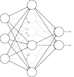 Dropout指的是在用前向传播算法和反向传播算法训练模型时,随机的从全连接DNN网络中去掉一部分隐含层的神经元。比如我们完整的DNN模型如下所示