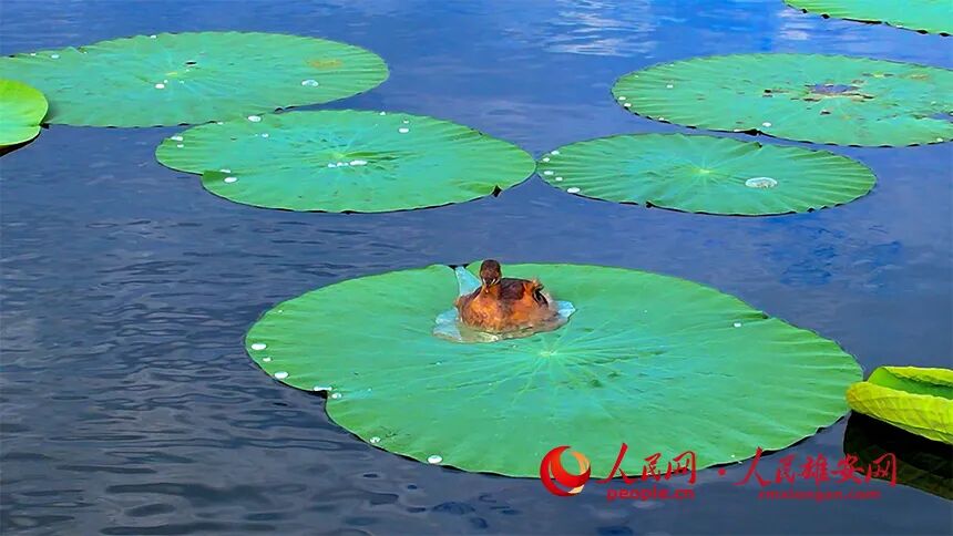 白洋淀里,在荷叶上休息的国家“三有”保护动物小鷿鷈。高腾摄