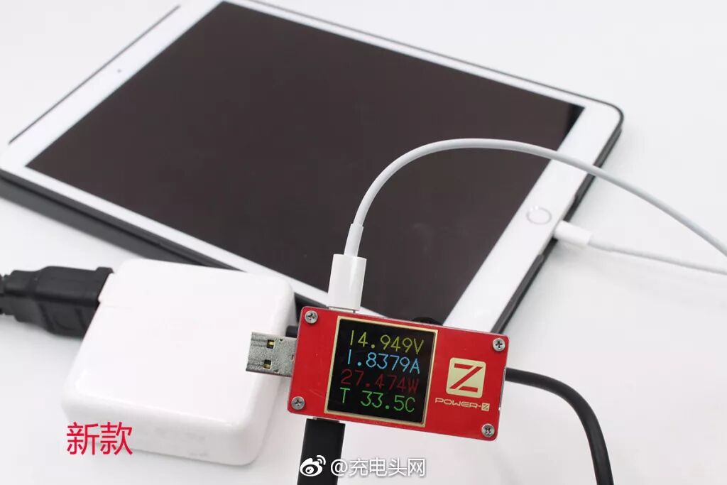 两款充电器均对iPad Pro成功开启USB PD高压快充模式,其中新款61W(A1947)充电器为15V高压快充,当前功率为27.47W;老款61W充电器(A1718)为9V高压快充,当前功率为17.70W。